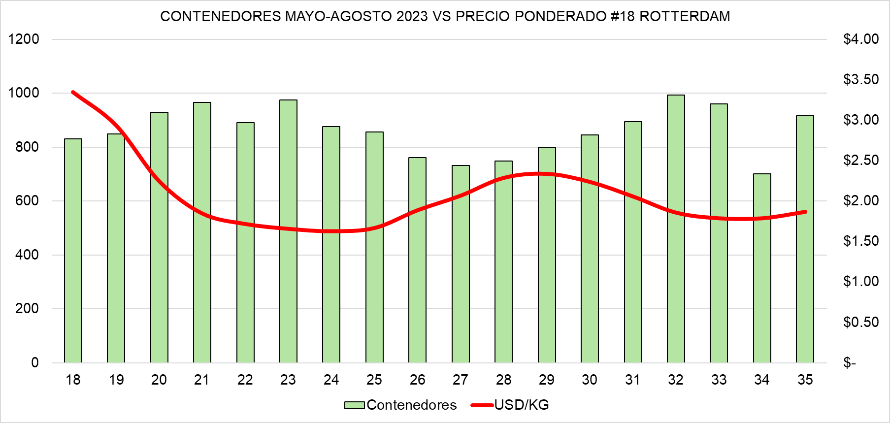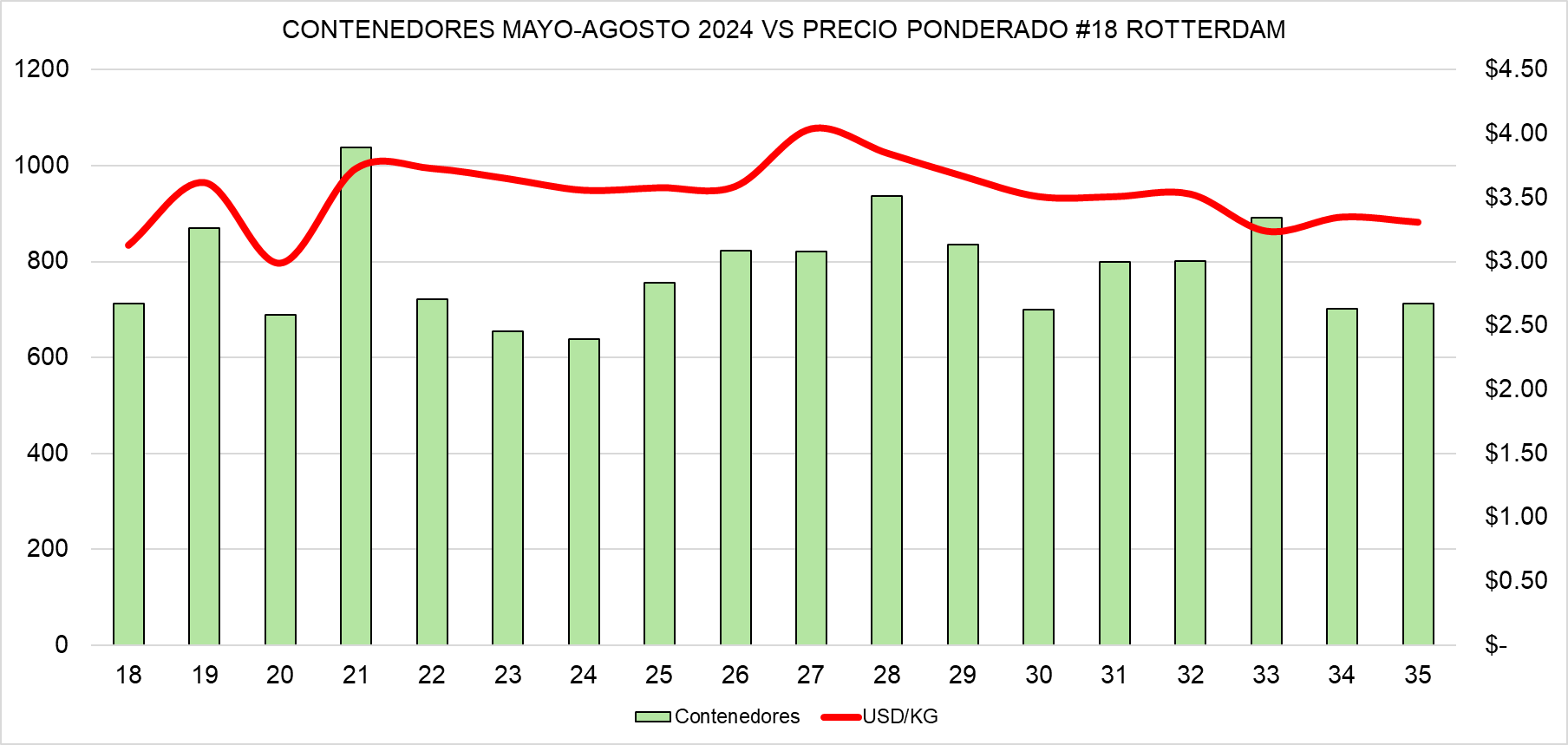 El análisis de Avobook se basa en las semanas 18 a 35, que abarcan de mayo a agosto, considerando el precio ponderado por kilo en dólares del calibre 18 en Rotterdam y el número de contenedores semanales. Los gráficos comparativos permiten visualizar cómo, en cada temporada, la curva del precio dibuja una “V” coincidiendo con el incremento de los envíos desde Sudamérica, especialmente desde Perú.