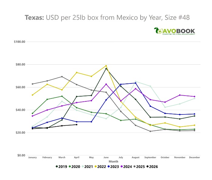 De acuerdo con el equipo de data de Avobook, durante febrero y marzo de 2026 los precios en el mercado estadounidense —específicamente en Texas para fruta mexicana— se han mantenido en niveles bajos, cercanos a su piso histórico. Esta situación se observa tanto en calibres como el #48 y #70, con valores considerablemente inferiores a los registrados en el mismo período entre 2022 y 2024, años en los que el mercado mostró cotizaciones significativamente más altas.